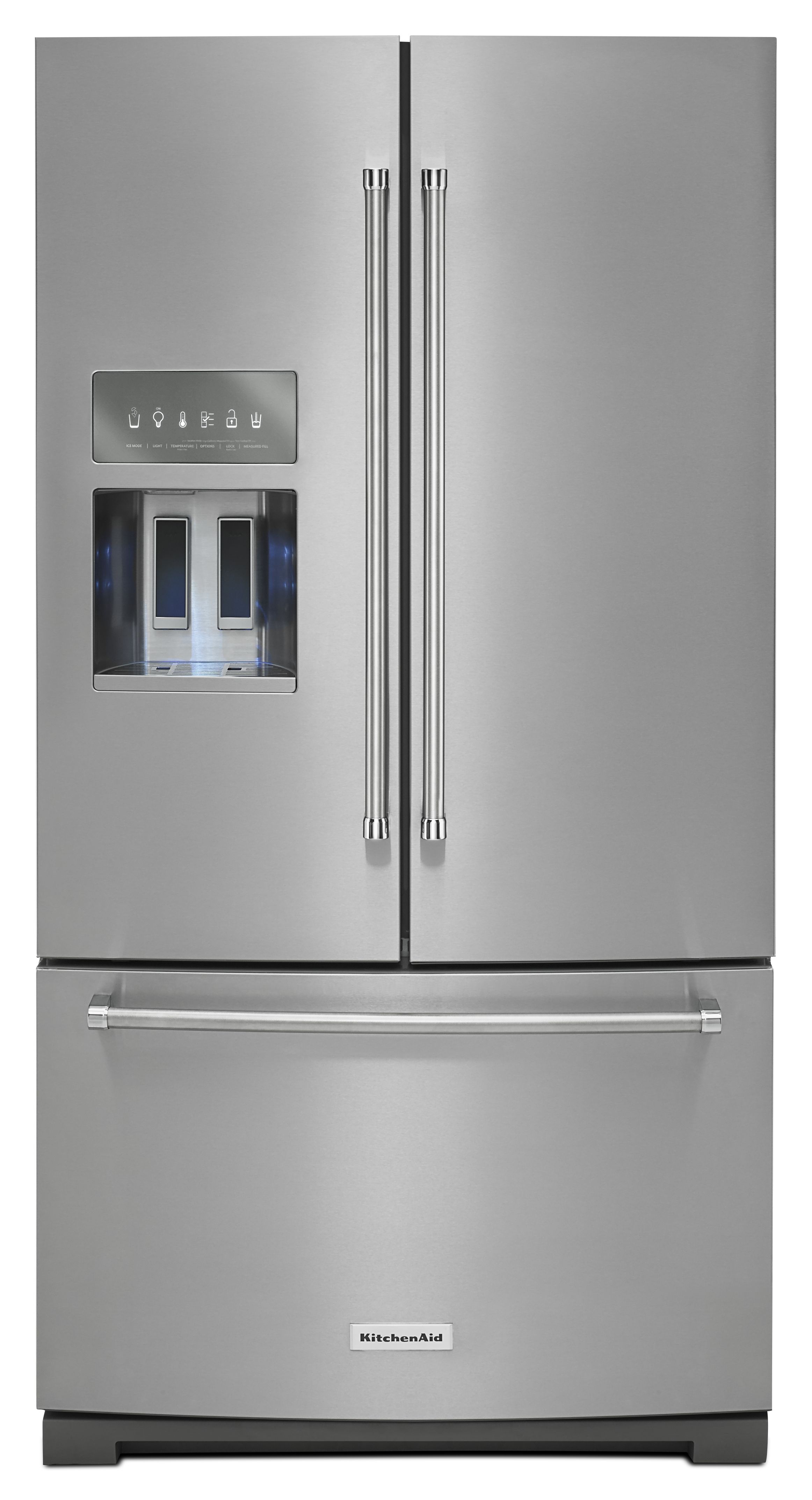 A bold blend of professionally-inspired styling and sleek touches for the home. This refrigerator features Satin Textured Handles with iconic KitchenAid Brand Medallions, a beautiful chrome frame surrounding the exterior water and ice dispenser and the KitchenAid® Badge.
