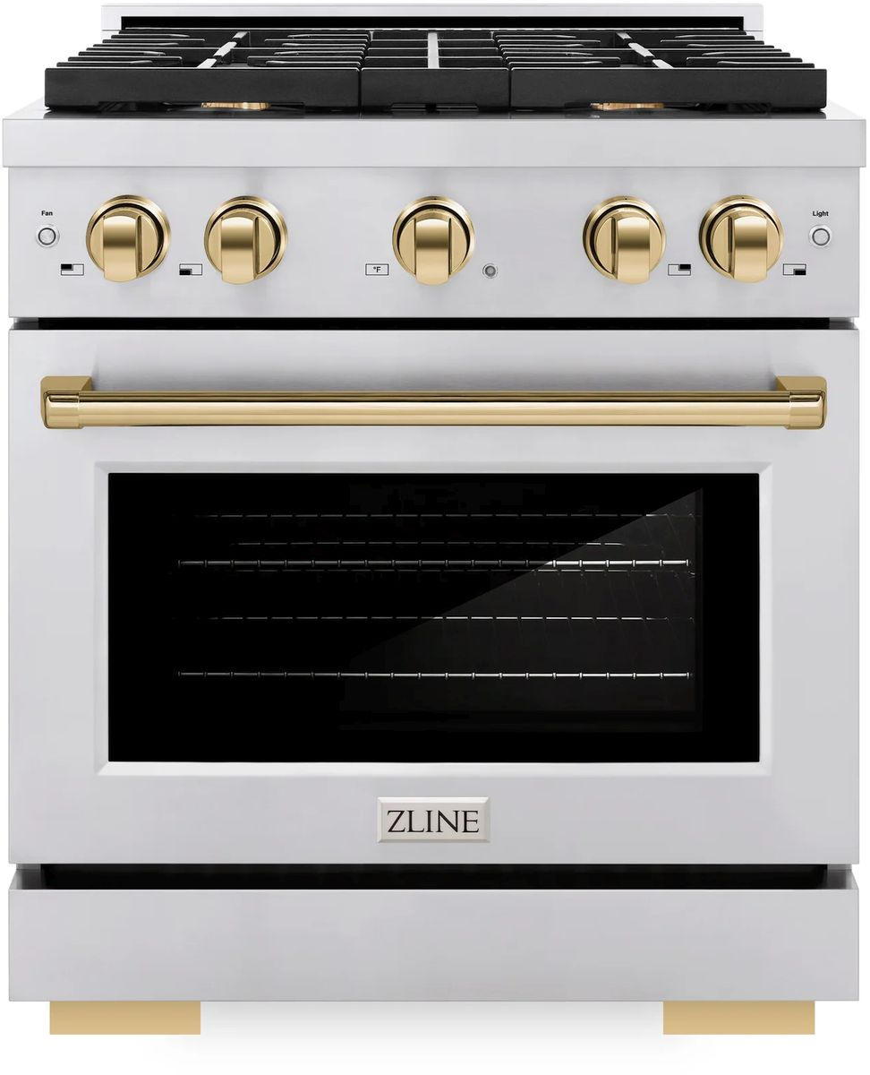 The ZLINE Autograph Edition 30 in. 4.2 cu. ft. Paramount Dual Fuel Range with 4 Burner Gas Cooktop and Electric Convection Oven in Stainless Steel with Polished Gold Accents (SDRZ-30-G) combines the versatility of a gas cooktop with 4 Italian-made auto-reignition burners, an electric convection oven with digital thermostat technology, enhanced cast iron grates, a Horizon oven door window design, and elegant polished gold knobs and handle allowing you to master every meal.