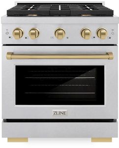 The ZLINE Autograph Edition 30 in. 4.2 cu. ft. Paramount Dual Fuel Range with 4 Burner Gas Cooktop and Electric Convection Oven in Satin Stainless Steel with Champagne Bronze Accents (SDRSZ-30-CB) combines the versatility of a gas cooktop with 4 Italian-made auto-reignition burners, an electric convection oven with digital thermostat technology, enhanced cast iron grates, a Horizon oven door window design, and elegant champagne bronze knobs and handle allowing you to master every meal.