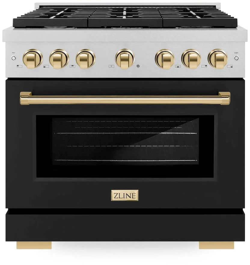 The ZLINE Autograph Edition 36 in. 5.2 cu. ft. Paramount Gas Range with 6 Burner Cooktop and Convection Gas Oven in Satin Stainless Steel with Black Matte Door and Polished Gold Accents (SGRSZ-BLM-36-G) features a versatile gas cooktop with 6 Italian-made auto-reignition burners, a high-performing gas convection oven, enhanced cast iron grates, a beautiful black matte door with a Horizon window design, and elegant polished gold knobs and handle allowing you to master every meal.