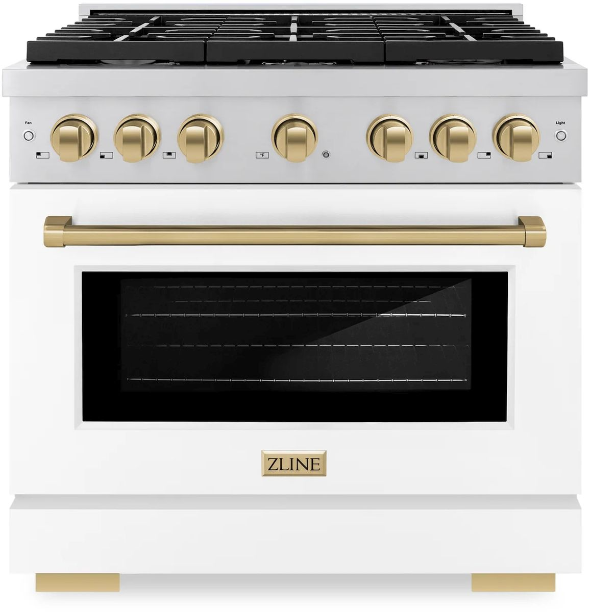 The ZLINE Autograph Edition 36 in. 5.2 cu. ft. Paramount Dual Fuel Range with 6 Burner Gas Cooktop and Electric Convection Oven in Stainless Steel with White Matte Door and Champagne Bronze Accents (SDRZ-WM-36-CB) combines the versatility of a gas cooktop with 6 Italian-made auto-reignition burners, an electric convection oven with digital thermostat technology, enhanced cast iron grates, a beautiful white matte door with a Horizon window design, and elegant champagne bronze knobs and handle allowing you to master every meal.