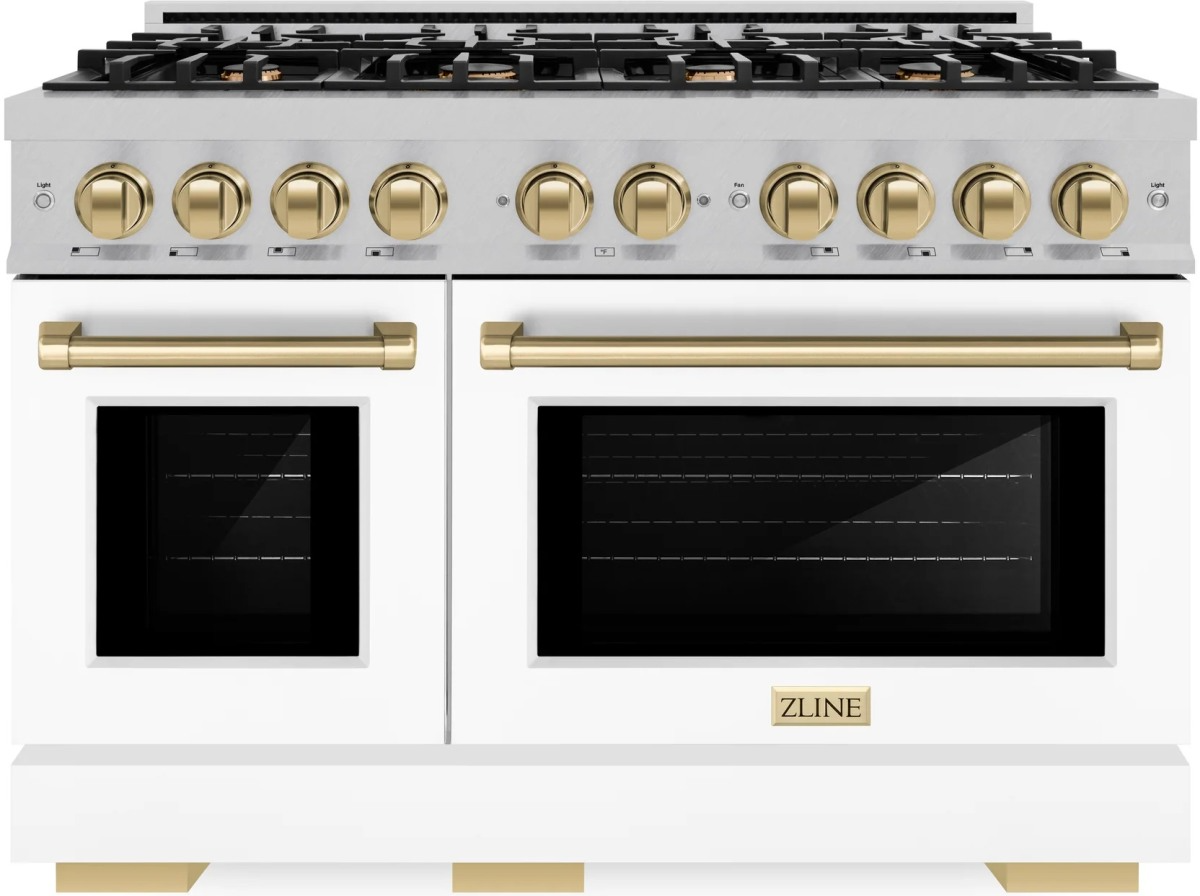 The ZLINE Autograph Edition 48 in. 6.7 cu. ft. Select Double Oven Gas Range with 8 Burner Cooktop in Satin Stainless Steel with Black Matte Doors and Champagne Bronze Accents (HGRSZ-BLM-48-CB) combines the elegance of a hand-finished porcelain gas cooktop with 8 Italian-made auto-reignition burners, a large gas convection oven with an energy-efficient cooling fan to ensure quiet operation, a small baking oven, beautiful black matte doors with Horizon window designs, and stunning champagne bronze knobs and handles allowing you to master every meal.