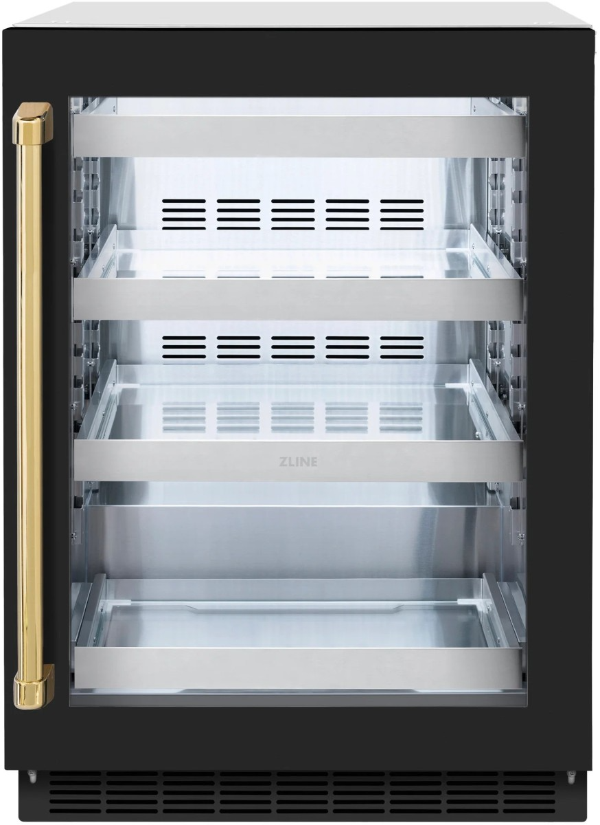 The ZLINE Autograph Edition 24 in. Touchstone 151 Can Beverage Fridge With Black Matte Glass Door And Polished Gold Handle (RBSOZ-BLM-24-G) features an outdoor-compatible cooling system and an integrated black matte glass door, giving you ultimate flexibility to host parties of any size.